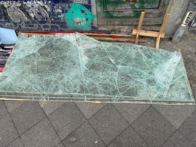 Thanks to everyone who supported at the spontaneous gathering this morning! We are left now cleaning up the mess and will be happy for donations to cover the repairing costs. The doors have to be changed and a new vitrine has been already ordered. Overall, the costs run up to a 4-digit number. Come by on Saturday at 1 PM for the next event to support living alternatives to capitalism in the city!