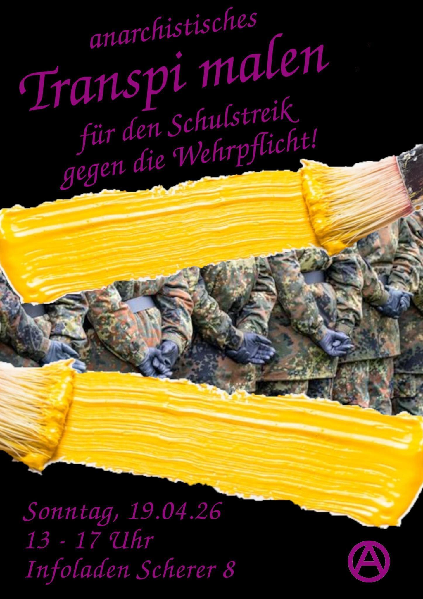 Am 8. Mai gehen Schüler:innen das 3. Mal gegen die Wehrpflicht auf die Straße. Wir wollen uns dem Schulstreik anschließen und wollen dabei auch unsere anarchistischen, anti-autoritären Perspektiven sichtbar machen.