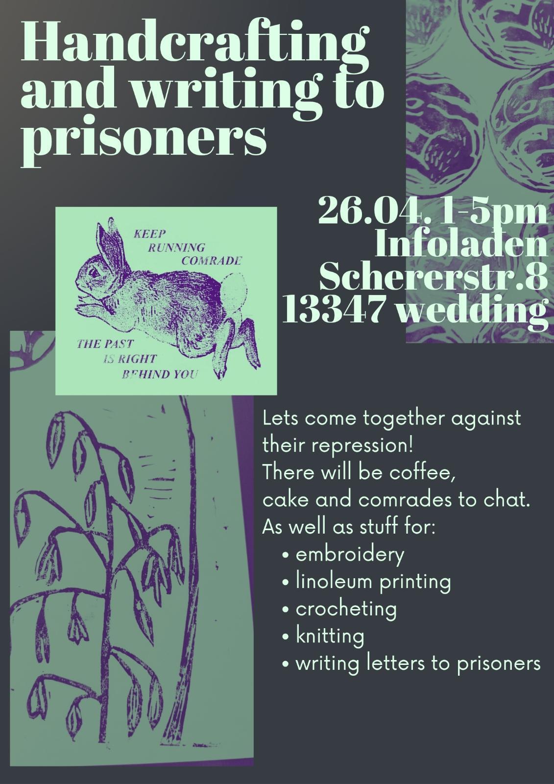 There will be materials for screen printing, card making, crocheting, knitting, embroidery, and writing letters prisioners. 💖